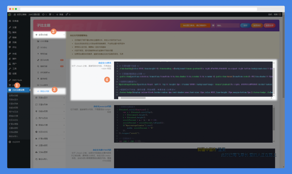 将以下JavaScript代码添加到您的主题的自定义JavaScript区域中。可以在WordPress后台导航Zibll主题设置 – 全局&功能 – 自定义代码 – 自定义javascript代码 里面。