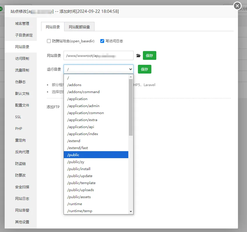 3.设置网站运行目录:进入“网站目录-运行目录”并将目录设置为 public。